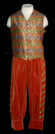A ‘Pakled' costume featured in the Star Trek: The Next Generation episode “Samaritan Snare” made up of crimped pants with a vertical line pattern, a tan woven top with long sleeves, and a quilted zigzag pattern vest that features a leather belt with metal clasp. The costume comes complete with … |