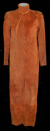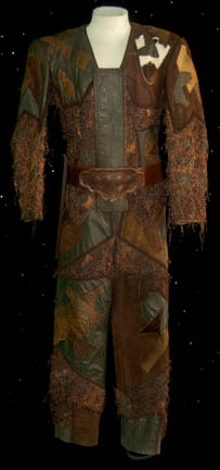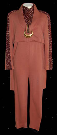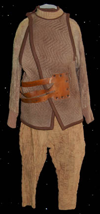 An elaborate costume made for the episodes “Gambit, Parts I and II” of Star Trek: The Next Generation. A soft brown colored jumpsuit worn underneath a sleeveless top with a leather midsection, and square patterned leather quilting to make up a harness which Velcro's and clasps to the jumpsuit. The … |