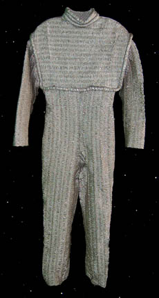 Featured in the episode “Angel One” of Star Trek: The Next Generation this costume was worn by “Wesley's Friend” as they came out of the holodeck, accidentally tosseing a snowball into the face of “Captain Picard” (Patrick Stewart). The costume is a full length jumpsuit made from silver crimped fabric … |