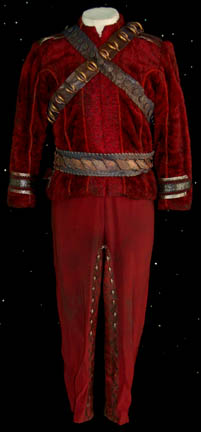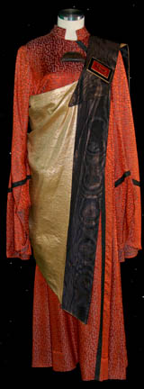 A set of Vulcan robes appearing in Star Trek feature films. The robe is a red geometrically patterned fabric with black trim lining with a sparkling black and gold colored sash that hangs from one shoulder featuring a resin badge with Vulcan iconographic lettering painted on it. |