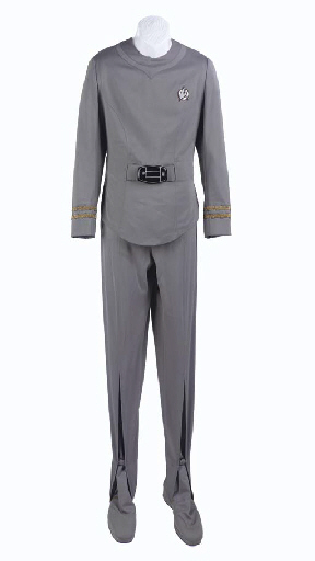 A grey Class-A officer's shirt and a matching pair of pants with sewn-in boots, both with <I>Western Costume</I> label inside inscribed <I>Leonard Nimoy</I> -- made for Leonard Nimoy as Spock in <I>Star Trek: The Motion Picture</I>, with corresponding wardrobe tag |