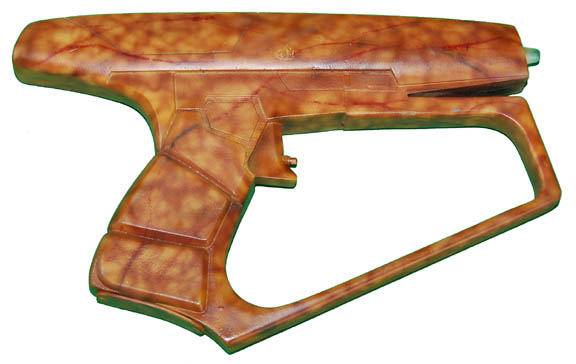 A prop weapon similar to those featured throughout 24th century Star Trek episodic television. Incarnations of this item have been used in Deep Space Nine by Ferengi and in the Voyager episode “Memorial”; it is a solid cast resin, painted metallic pewter with black, metallic-copper and blue textured accents. The … |