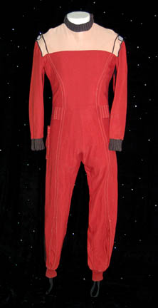 A Starfleet crewman uniform jumpsuit in the style of the Star Trek feature films being a full length red jumpsuit with black ribbed cuffs and collar, and tan shoulders, loops for a belt, black accent stripes running down the length of the outsides of the legs, and gray division strips … |