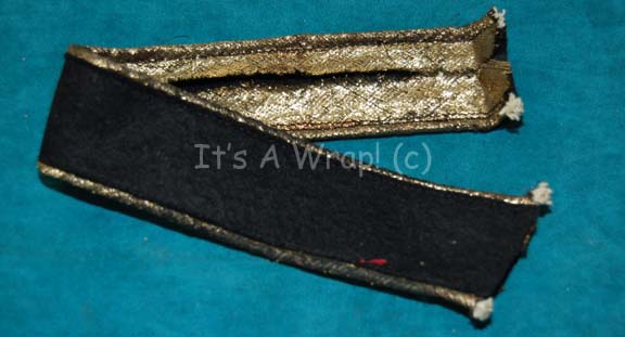 A length of costume fabric created for Starfleet officer uniforms appearing in Star Trek feature films. The item is a black felt backing with gold colored trim made to be combined with a colored fabric thus creating a division strip. The item measures approx. 14 X 1.75 inches. |