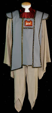 A costume featured in Star Trek VI: The Undiscovered Country for wear by Vulcan Khitomer Attendees. The costume is trousers with a top with matching sleeves. The top features a red iridescent flower patterned chest and is worn under a gray tabard with gold patterned trim lines and a Vulcan … |