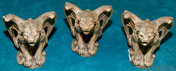 A trio of plaster gargoyles featured in the Star Trek: Enterprise episode “Civilization” appearing in the scene taking place as an “Enterprise” away team enters the shop of an alien in disguise. The gargoyles are painted beige with distress to appear aged and made to have their left wing ‘fixed' … |