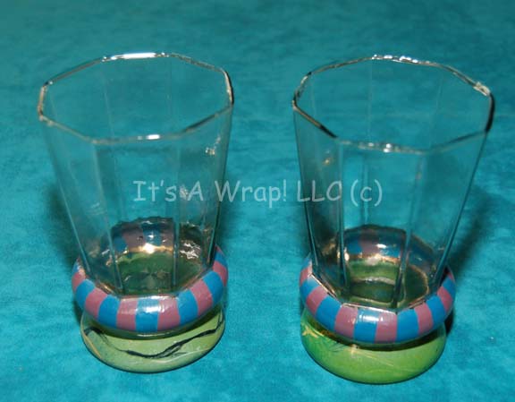 A pair of octagon shaped clear glass drinking vessels featured in the Star Trek: Enterprise episode “Azati Prime”. Appearing during scenes when “Degra” (Randy Oglesby) and his crew are toasting to their impending success, the items are ‘Victoria and Richard MacKenzie-Childs LTD’ name brand glasses painted with blue and purple … |