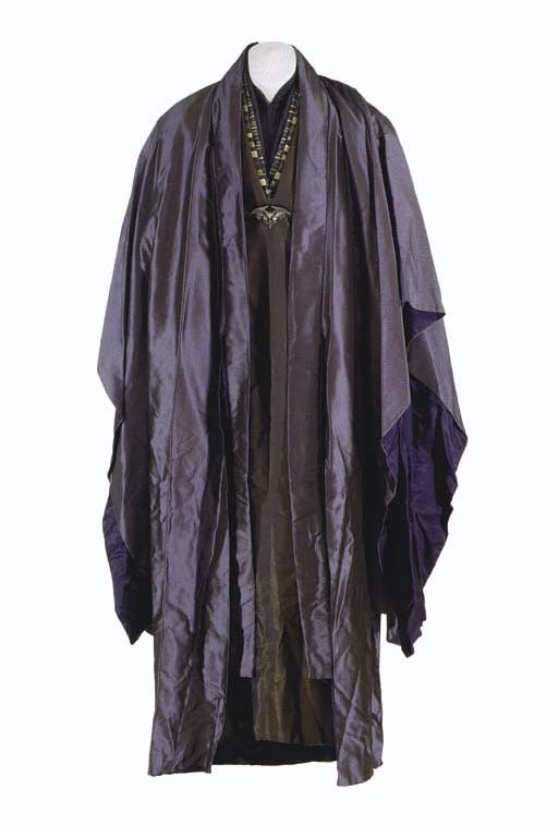 A Romulan Senator's costume consisting of black silk robe with long kimono-style sleeves, a dark navy blue silk gown, a dark navy blue silk dickie, two pairs of black pants, a pair of black leather shoes and a loose Romulan warbird cast resin pin with gunmetal finish -- worn by … |