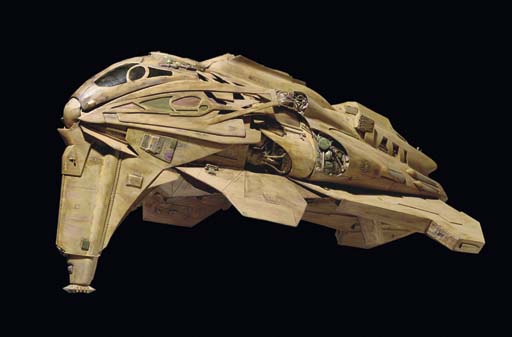 A teardrop-shaped alien spacecraft model painted yellow -- <I>30x7x14in.</I> -- used in the first season of <I>Star Trek: Voyager</I> |