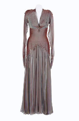 A full-length gown of two-tone silver-grey and red silk chiffon, the bodice with pleated detail; with corresponding wardrobe tag -- worn by Famke Janssen as Kamala in "The Perfect Mate" in <I>Star Trek: The Next Generation</I> |