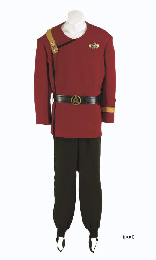 Two <I>Star Trek II</I>-style officer's burgundy uniform jackets and a pair of black pants, one jacket with department shoulder strap and cuff band, with captain's bars and pips, labels in jackets inscribed <I>J Doohan</I> and <I>James Doohan</I>, pants <I>James Doohan</I>, and a black leather belt -- made for James Doohan … |