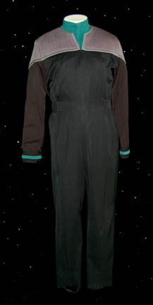 A Starfleet uniform in the style that made its first appearance in Star Trek VIII: First Contact comprised of a full-length black jumpsuit with gray quilted shoulders. The jumpsuit features black elastic stirrups at the feet, a form fitting elastic waistband sewn inside with attached loops for ‘away team' gear, … |