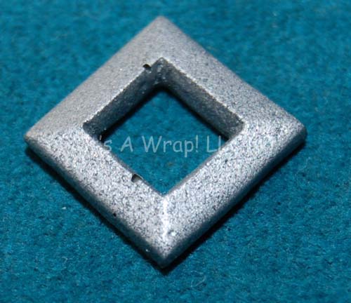 A molded resin rank accent for crewman’s costumes appearing in various Star Trek feature films. The item is a small square with beveled sides and an empty square center. The item measures approx. .6 X .6 inches. |