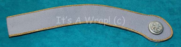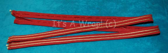 A pair of fabric strips featured on the costume trousers of Starfleet uniforms in Star Trek feature films. The items are folded over and stitched sealed with gold colored fabric stripes, two side by side; meant to be sewn onto the outside seam of trousers to indicate the wearer to … |