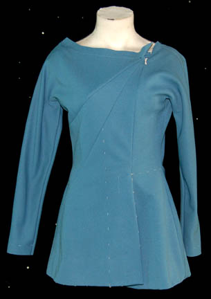 An unfinished blue polyester double-knit asymmetrical sunburst pattern dress believed to have been made for Star Trek: Phase II for wear by Majel Barrett in her portrayal of “Nurse Chapel”. The dress has a large open unfinished collar, long sleeves, white thread lines, un-hemmed sleeve cuffs and a zip front. … |