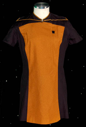 A female Operations gold skant made for wear during the Star Trek: The Next Generation series. The skant is black with a gold center section on the front and back and gold trim on the shoulders. There is a discreet zip up the front and a small Velcro patch on … |