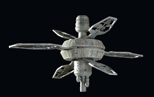A visual effects model of a space structure with several outboard panels, with top and bottom mount plugs -- <I>36x19x19in.</I> -- made as the Caretaker's array for "Caretaker," the two-hour pilot movie for <I>Star Trek: Voyager</I>, modified for subsequent use |