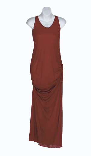 A full-length sleeveless gown of red lycra, with ruched details to each side, with detached sleeves; with corresponding wardrobe tag -- worn by Teri Hatcher in "The Outrageous Okona" in <I>Star Trek: The Next Generation</I> |
