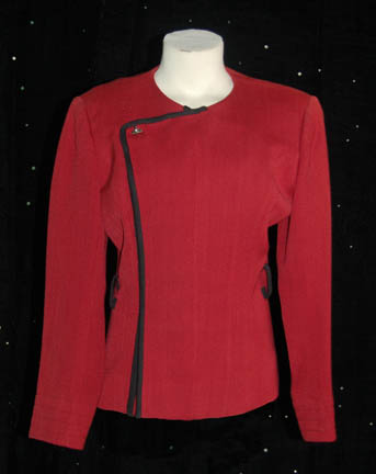 A red Starfleet officer's jacket made in the famous style of Star Trek II: The Wrath of Khan. The jacket features black nylon interior lining, black piping around the double-breasted front which folds over the other cream colored breast; the seal is made by a series of snaps and; the … |