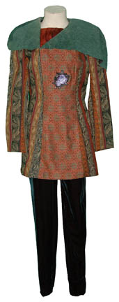 A costume featured in the Star Trek: Deep Space Nine episode “Taking Into the Wind” worn by “Luaran” (Kitty Swink), a Vorta ship commander killed by “Garak” (Andrew Robinson). The costume is made up of a soft green velour sleeveless jumpsuit with an elaborately patterned costume top with a suede … |