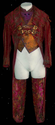 A costume worn by Armin Shimerman during his portrayal of “Quark” in Star Trek: Deep Space Nine. The costume is composed of a cropped purple shirt with a gold colored patterned vest, and a red and yellow striped overcoat with an extremely long pair of tails. The costume is distressed … |