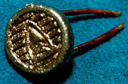 A gold colored metal “pip” made for wear by commissioned officers in various Star Trek feature films. The item is a small circular piece with multiple line etches broken by the etched in Starfleet arrowhead logo centered on the item. It also features a soldered wire attached to the reverse … |