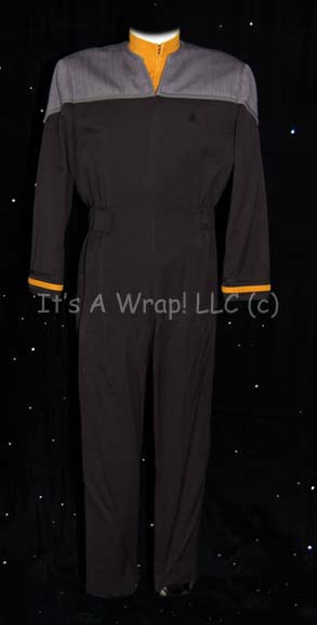 A Starfleet uniform jumpsuit featured in Star Trek X: Nemesis for wear by LeVar Burton in his portrayal of “Geordi La Forge”. The costume is a black jumpsuit with a form fitting interior elastic waist belt, gray quilted shoulders, and operations gold division strips around the sleeve cuffs, and sewn … |