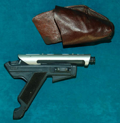 A prop energy pistol and accompanying holster featured in the Star Trek: Enterprise episode “Fallen Hero” for use by ‘Mazarite' alien characters. The item is a sturdy resin prop hand gun with a ridged grip and multiple molded details, an acrylic disk mounted in the nose of the item, and … |