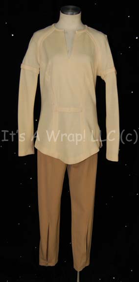 A costume featured in the first Star Trek feature film. This costume consists of a crème-colored, Class-B, short-sleeved Starfleet uniform shirt and tan trousers. The lot comes with these unattached items; Command white shoulder division strips, matching white backed Epsilon IX assignment patch, and a plastic bio-monitor with painted accents. … |