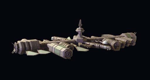 A space station model comprising variously shaped modules and habitats attached to a linear core structure -- <I>52x26in.</I> -- featured in "Fair Trade" in <I>Star Trek: Voyager</I> |