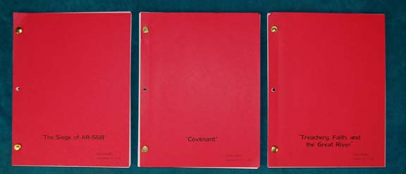 A lot of three scripts for seventh season episodes of Star Trek: Deep Space Nine. The first script is for the episode “Treachery, Faith, and the Great River”; “Weyoun” (Jeffrey Combs) contacts “Odo” (Rene Auberjonois) stating that he wishes to defect and “Nog” (Aron Eisenberg) teaches “Chief O’Brien” (Colm Meaney) … |