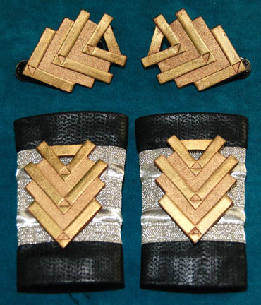 A set of four wardrobe accents featured in the Star Trek: Enterprise episodes “In a Mirror, Darkly, Parts I and II” for wear on Starfleet uniforms in the Terran Empire of the Mirror Universe. The items are black faux leather shoulder boards with a thick silver colored band and a … |