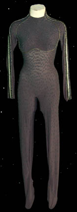 A costume featured in the Star Trek: Enterprise episode “Rajiin” where “Enterprise NX-01” takes on a beautiful, mysterious woman from the planet Oran'taku who turns out to not be who she says she is. The costume is a full length gray cat suit with little jewels sewn in all over … |