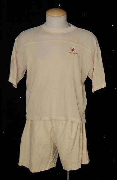 A costume featured in Star Trek VI: The Undiscovered Country for wear by crewmen on board the “U.S.S. Excelsior”. The costume is a set of crème-colored shorts with an elastic waist and a matching mesh, short-sleeved shirt with a fabric logo triangle affixed to the left breast of the Starfleet … |