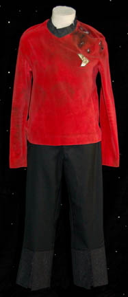 A distressed costume featured in the Star Trek: Enterprise episodes “In a Mirror, Darkly, Parts I and II” for wear by Terran Empire crewmen who assumed the uniforms of the hijacked “Starship Defiant” and actual crewmen of the ship who appeared ‘killed' on screen. The costume is a red Star … |