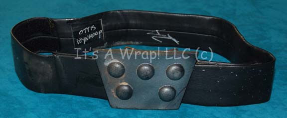 A costume accessory appearing in Star Trek feature films and episodic television – a Klingon belt and buckle. The item is black vinyl with a resin buckle painted metallic silver with five metallic gold colored ‘studs' and a pair of wire loops molded into the reverse. The belt measures approx. … |
