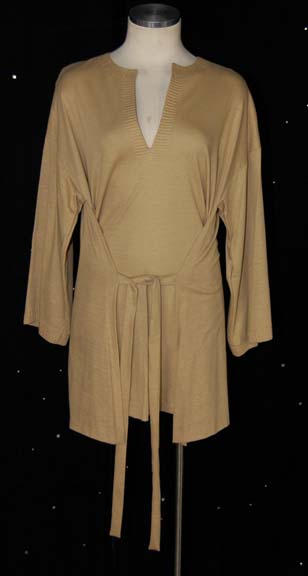A costume element featured in the first Star Trek feature film. This item is a long-sleeved, light-olive colored shirt featuring slight ribbing around the collar and slits up the sides. A sewn in Western Costuming tag reads ‘Size 40’ and an original costumer’s tag reads ‘Lily style #1, Size 40’. |