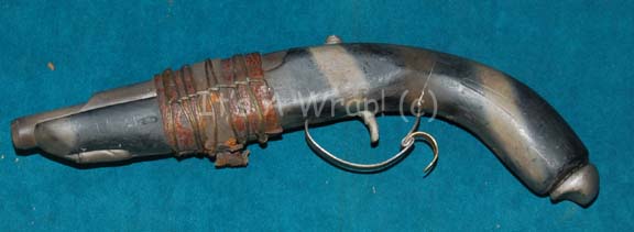A prop handgun appearing in the Star Trek: Enterprise episode “Desert Crossing” in the arsenal of “Zobral” (Clancy Brown). The item is made from molded resin painted to appear distressed with age and camouflaged. The trigger guard is metal as is an embedded barrel. Leather is wrapped around the barrel … |