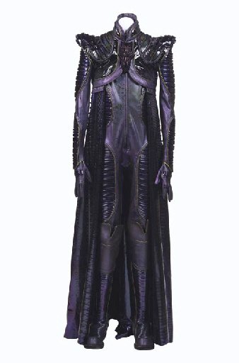 A full-length sleeveless jumpsuit of two-tone purple/green vinyl, with ribbed, quilted patches to the chest, arms and legs; with corresponding cape and long-sleeved bolero jacket; a pair of gloves; and a pair of boots -- worn by Tom Hardy as Shinzon in <I>Star Trek: Nemesis</I> (7) |
