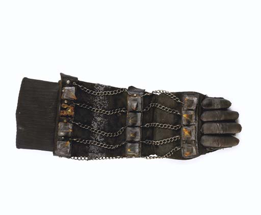 A heavy glove of imitation leather, with foam rubber spikes and chains; with corresponding wardrobe tag -- worn by Michael Dorn as Worf in his holodeck Klingon battle exercise program in "Where Silence Has Lease" in <I>Star Trek: The Next Generation</I> |