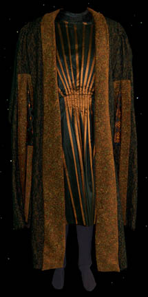 This adorable costume was worn by a small Klingon child during the Star Trek: Deep Space Nine series. It consists of a long-sleeve tunic made of multiple textured and smooth fabrics in shades of brown, purple and green. The shoulders are made of orange faux fur and the tunic comes … |