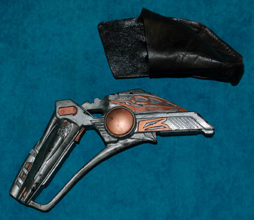 A prop hand weapon featured in the Star Trek: Enterprise episodes "The Awakening" and "Kir'Shara" during which the “Enterprise NX-01” crew diffuses a stand off between the Vulcans and Andorians. The item is a cast resin prop painted grey with intricate bronze-colored accents and includes a black vinyl holster with … |