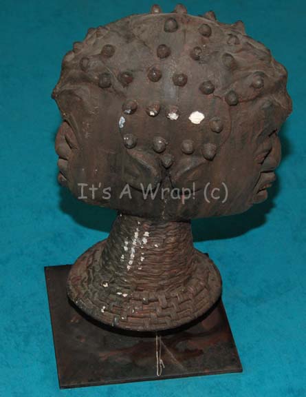 Klingon themed sculpture of two faces staring out and away from one another believed to have appeared variously in Star Trek episodic television. The item is presented on a metal base. |