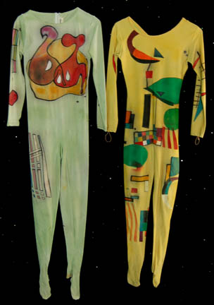 These two colorful circus performer costumes are from an artificial reality created by the Kohl during the Star Trek: Voyager episode “The Thaw” in which “Harry Kim” (Garrett Wang) and “B'Elanna Torres (Roxann Dawson) find themselves in a twisted computer program based on fear. Both Lycra jumpsuits have long sleeves, … |