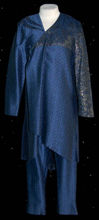 A blue patterned three piece costume featured in the Star Trek: Voyager episode “Prime Factors”. The costume consists of a blue/green jumpsuit with a very small short sleeved shirt and a larger similar shirt with multi-colored fabric and inset gold sparkles. The costumer's tag reads ‘Jeff Jensen’ and ‘Geoffery Smart’. |