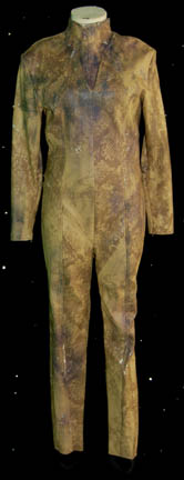 A lemon colored costume jumpsuit with a crimped over drape featured in the Star Trek: Voyager episode “Emanations”. The over drape featured a pleated patterned horizontal lining and a patterned mesh accent with a large brass colored badge with white geometric insets and a teal and a blue stone. A … |