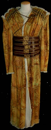 A costume featured in the Star Trek: Voyager episode “Flesh and Blood: PART I”; wherein “Voyager” answers a distress call from a Hirogen base that has been utterly decimated by the holograms from the holodeck technology that “Captain Janeway” (Kate Mulgrew) gave them. This costume is a long-sleeved, metallic-copper tunic … |