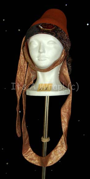 A costume element of the style featured in “Search for Spock” and “The Voyage Home”. A rust-colored felt , Vulcan-style hat featuring black trim with a yellow, orange, and deep violet floral pattern, further accent on the back, gold and copper iridescent chin strap and scarf draping across the neck; … |