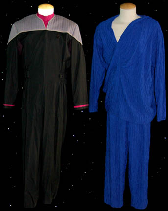 A stunt Starfleet uniform jumpsuit created for wear by Clint Lilly and a set of blue pajamas created for wear by Jonathan Frakes, both for their portrayal of “Commander Riker”. The uniform is black with gray quilted shoulders and command red division strips on the sleeve cuffs with a red … |