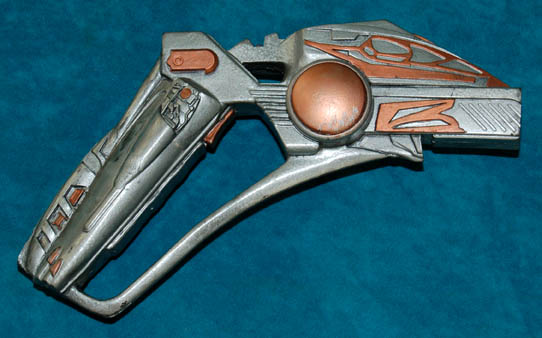A prop hand weapon featured in Star Trek: Enterprise episodes like "The Awakening" and "Kir'Shara"; wherein the “Enterprise NX-01” attempts to diffuse a stand-off between the Vulcans and Andorians while “Captain Archer (Scott Bakula) and “T’Pol” (Jolene Blalock) search for an ancient Vulcan artifact. This prop weapon is rubber cast … |